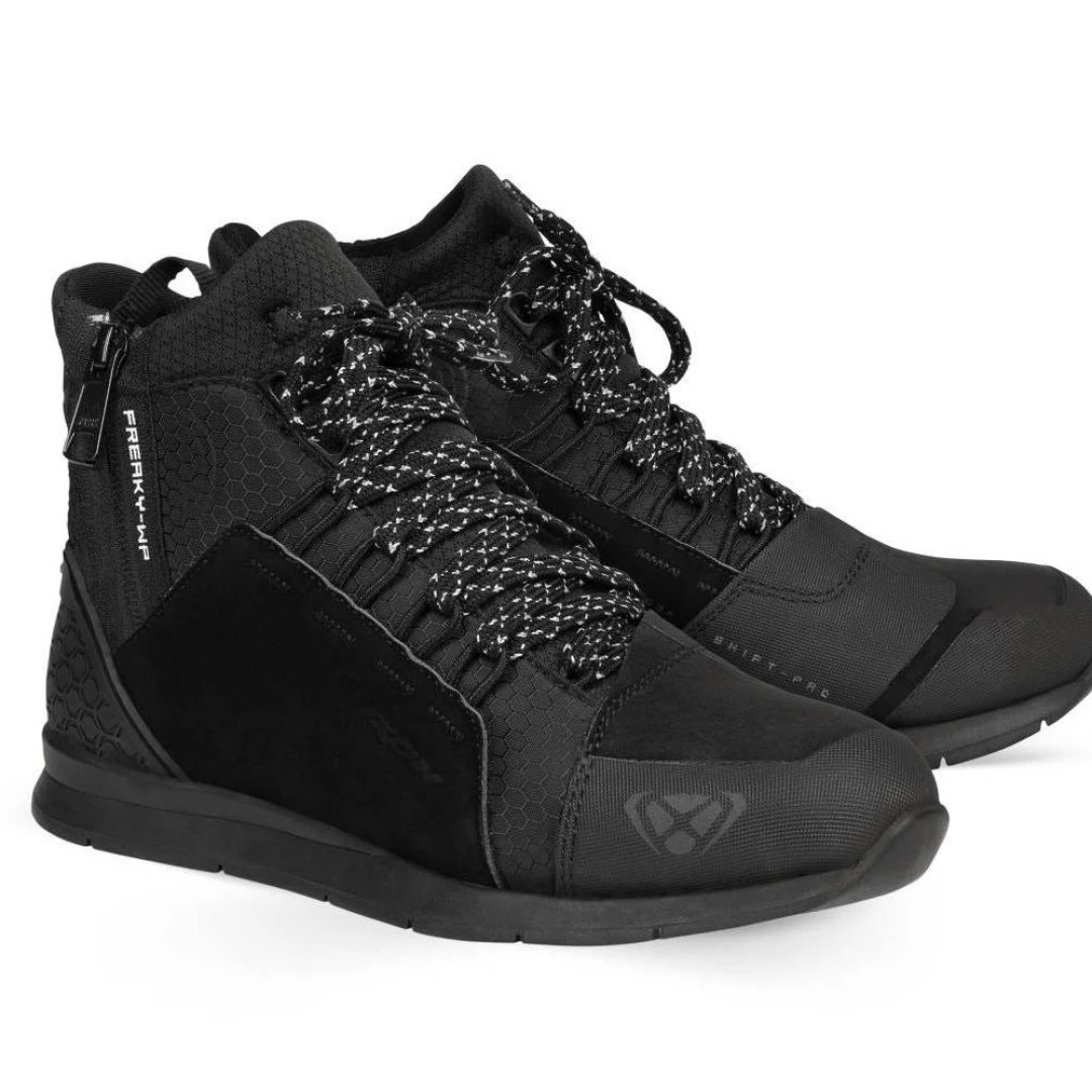 Ghete moto Urban barbati All Season Ixon model Freaky WP MS culoare: negru (100% waterproof) Ghete urbane waterproof, foarte comode si cu un aspect modern Descopera in acest model stilul urban de top, plus confort marit. cu aceste ghete, poti folosi motocicleta sau scuterul in oras cu o atitudine dinamica si moderna. Ghetele sunt waterproof si au tot felul de detalii care le fac extrem de confortabile. In concluzie, ghetele Freaky WP este o alegere excelenta in calatoriilor urbane. Descriere: • culoare: negru; • ghete all season; • tip: Urban; • ghete waterproof. Caracteristici: • impermeabilitate: da - waterproof (26000 Schmerber); • membrana waterproof + breathable; • protectie termica: minima . Siguranta: • model certificat CE, level 2, standard omologare: EN 13634:2017 (Level 1111 WR); • membrana Waterproof and breathable (26000 Schmerber); • intarituri la calcai; • intarituri la degete. Specificatii tehnice: • exterior: polyurethane Suede + alveole Ripstop; • exterior (partea superioara): 50% polyester; 31% polyurethane; 13% nylon; 6% vinil polychloride; • interior: mesa (mesh) 100% polyester; • talpa: 100% cauciuc; • fermoar in partea laterala exterioara, pentru o incaltare mai rapida. Functionalitate si confort: • sistem fixare cu sireturi si fermoar in partea exterioara a ghetei; • usor de incaltat, datorita urechii din spate.