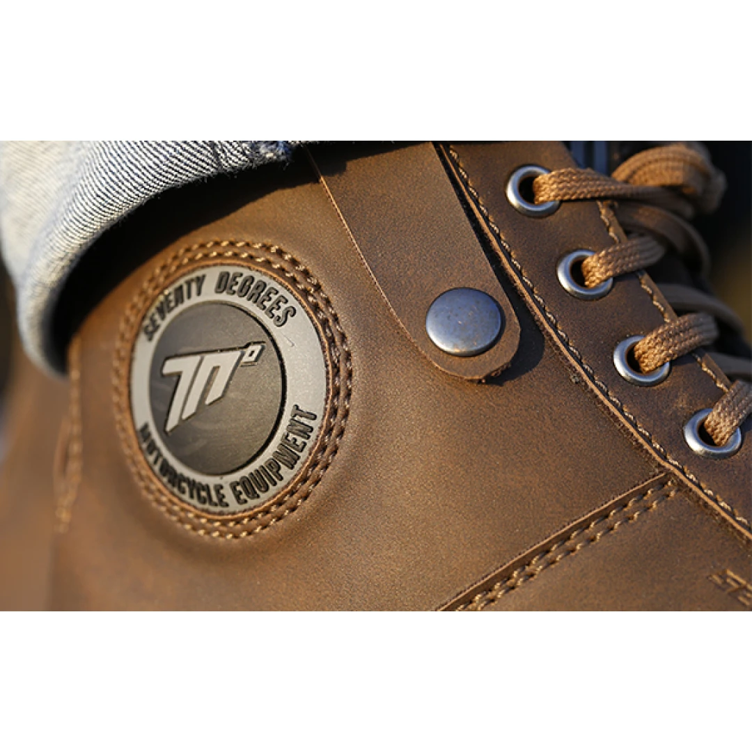 Ghete moto Urban Unisex Seventy model SD-BC7 culoare: maro Caracteristici: • culoare: maro; • marimi disponibile: 39-49; • utilizare: unisex; • ghete omologate: CE Approved: EN 13634:2017; • aspect casual; • 100% "breathable"; • insertii reflectorizante in partea din spate a incaltamintei si in lateral, pentru o vizibilitate crescuta; • ghetele sunt prevazute cu protectie pentru pedala de schimbator a vitezelor; • talpa tratata anti alunecare; • in partea laterala exterioara a ghetei se pot fixa sireturile cu capsa, pentru a nu se agata de componente ale motocicletei; • ghete intarite la calcai si degete; • ghete fabricate din microfibre, ideale pentru utilizare zilnica; • pentru o fixare mai buna a ghetei pe picior, pentru un confort sporit si o siguranta maxima, ghete se regleaza cu sireturi de inalta calitate si cu fermoar in partea din interior.