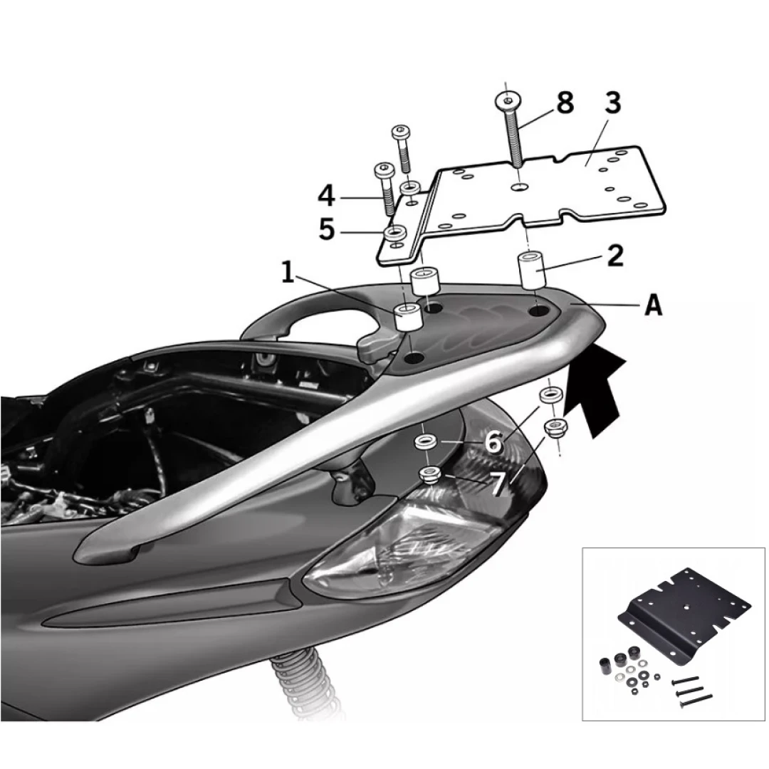 - sub acest cod se livreaza doar placa metalica + suruburile aferente, pe care se fixeaza gratarul de plastic al top case-ului + top case-ul;