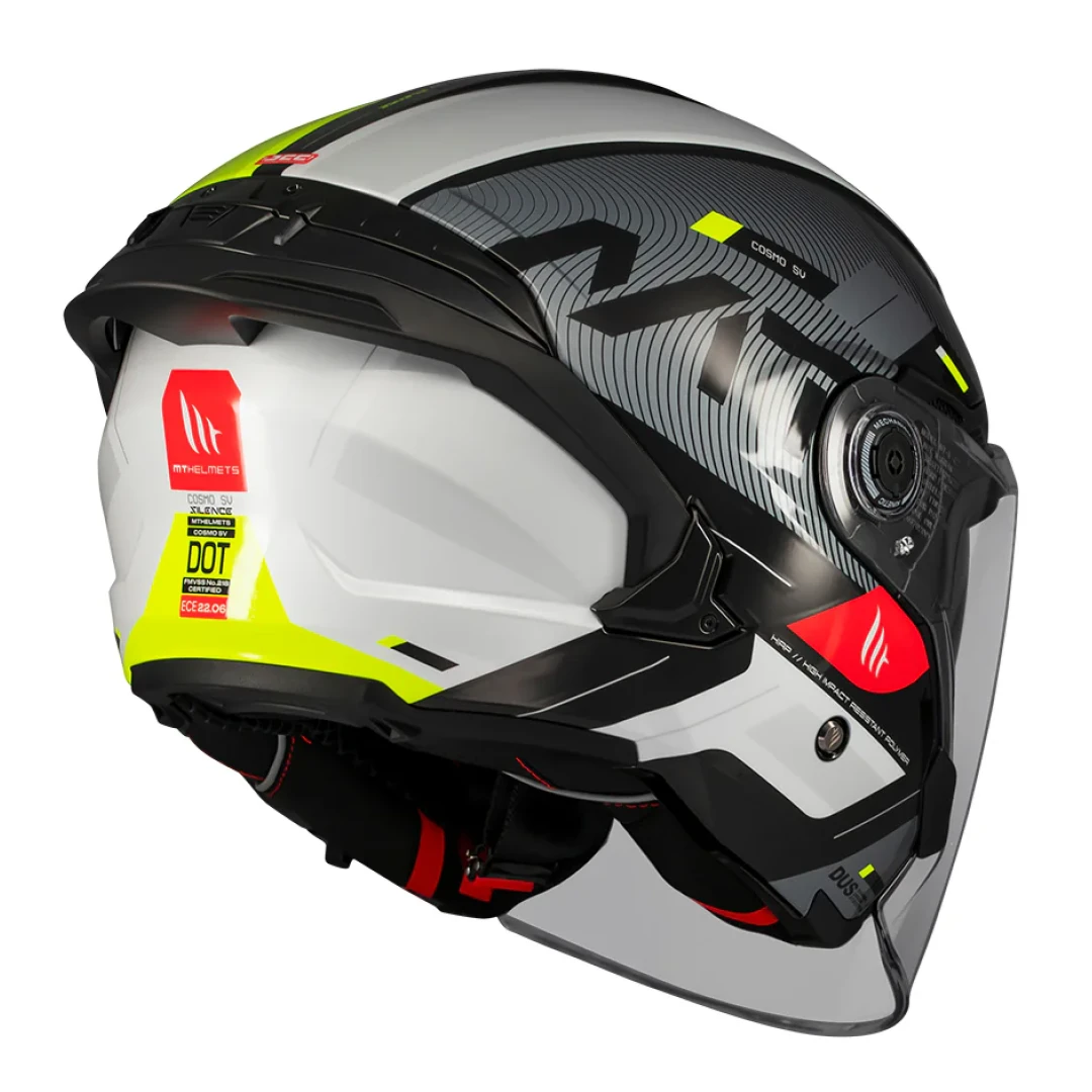 • modelul Cosmo SV incorporeaza ultimele cartacteristici si inovatii ale producatorului MT in materie de casti: sistemul de schimbare foarte rapid al vizierei QVSS, erodinamica optimizata cu sistem nou de ventilare, si 2 tipuri de spoilere.
