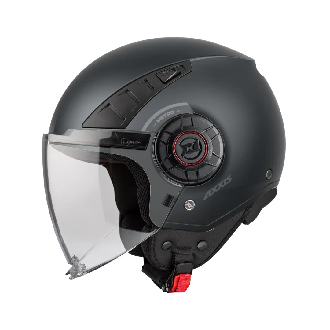 Axxis Metro S este una dintre cele mai atractive si stilate casti open face (jet) de pe piata. Designul castii ii confera personalitate, si datorita vizierei mari, a ventilatilor din partea superioara a castii dar si mecanismelor de viziera branduite cu logo-ul Axxis.