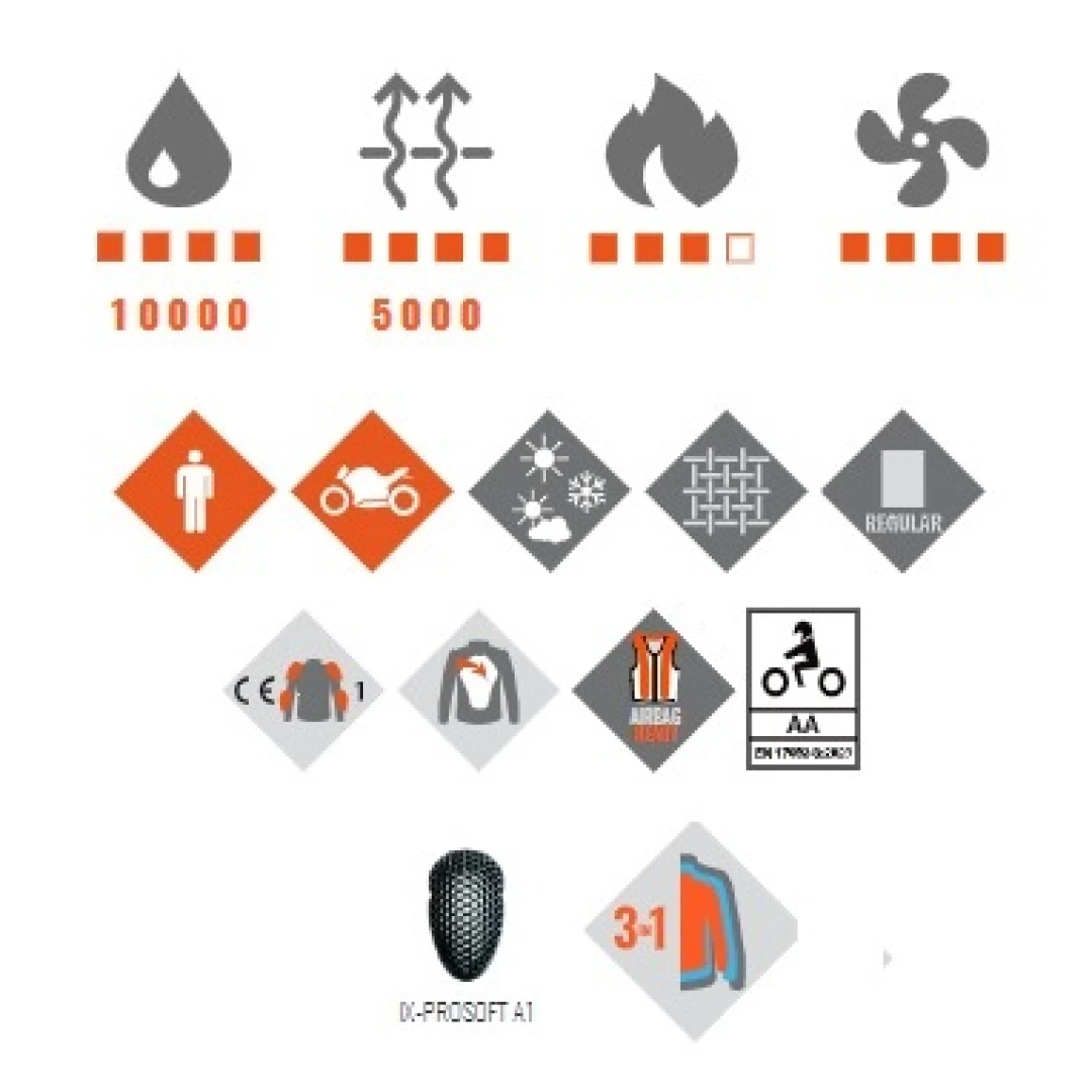• protectii: protectii flexibile si "breathable" la coate si umeri Level 1 (umeri: IX-PROSOFT A1, level 1; coate: IX-PROSOFT A1, level 1;
