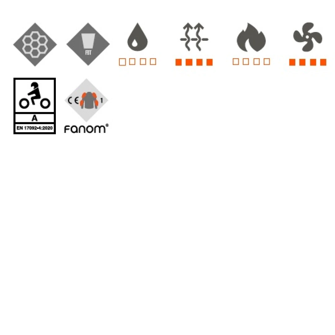 Geaca contine ultimele tipuri de protectie de la Ixon - gama FANOM; protectiile de coate si umeri fiind incluse. Optional, geaca se poate echipa si cu protectie de spate si piept, datorita faptului ca geaca este prevazuta cu buzunare pentru aceste protectii.